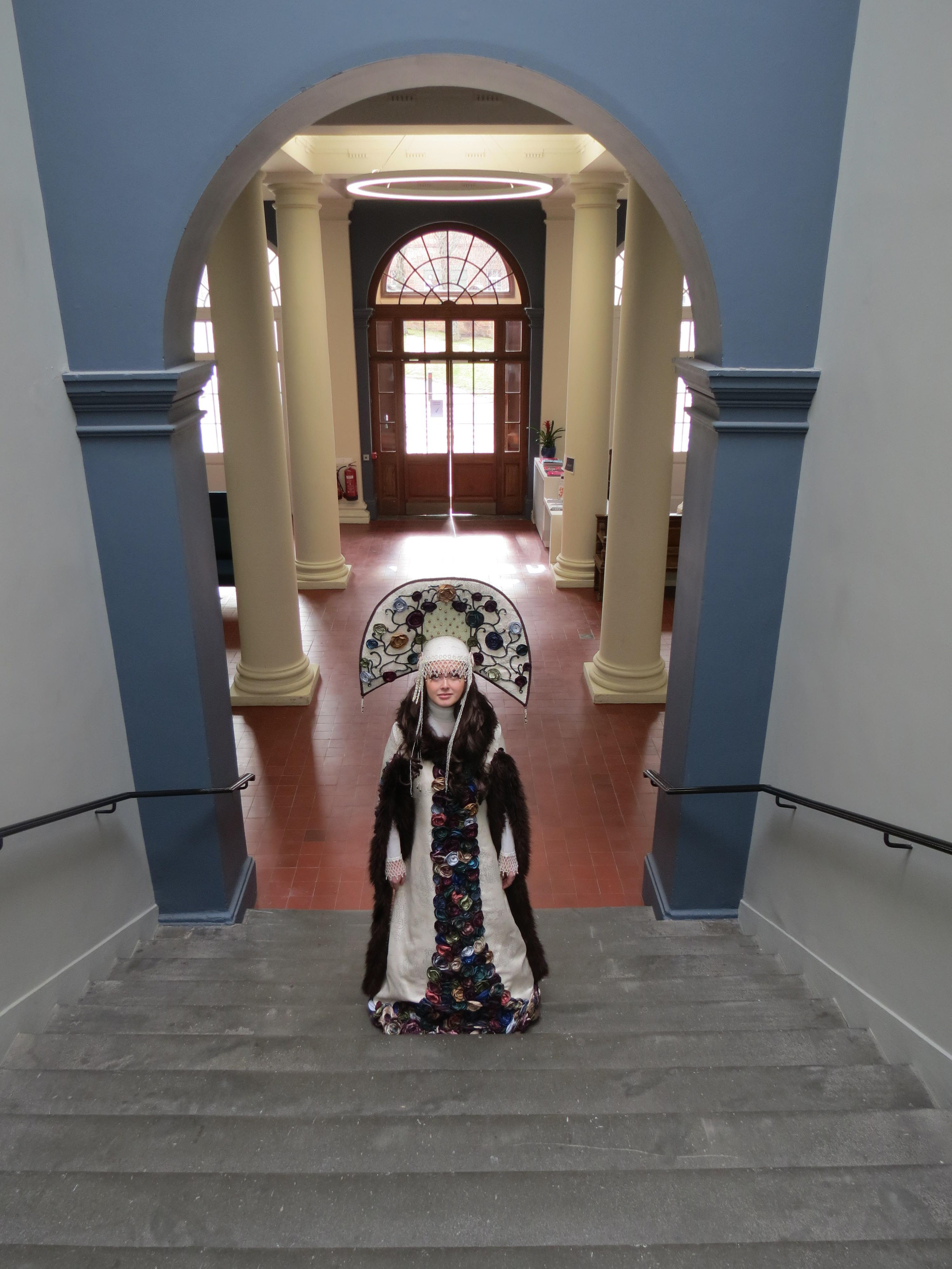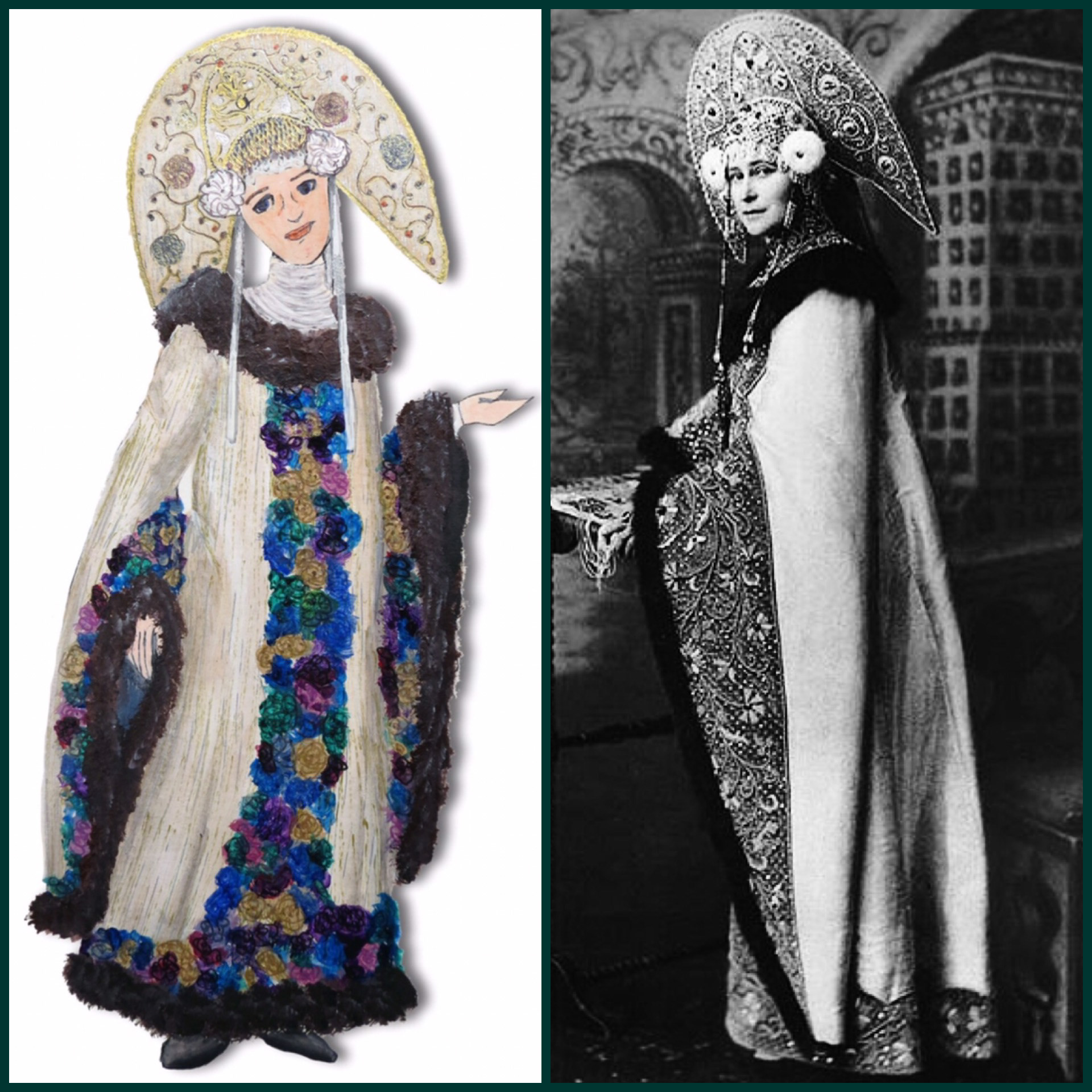 The first costume is based on the gown and kokoshnik worn by the Grand Duchess Elizabeth Feodorovna at the Winter Palace costume ball in 1903, sister to the Empress.